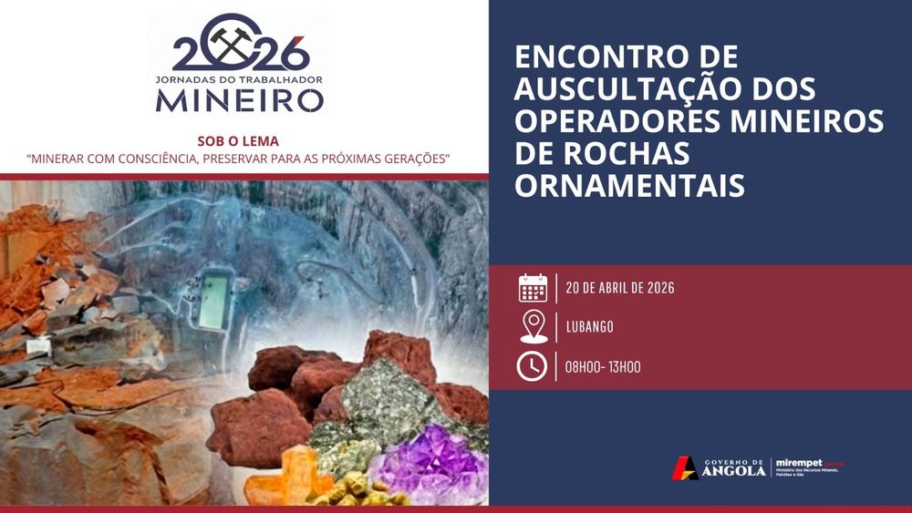 O Ministro dos Recursos Minerais, Petróleo e Gás, Diamantino Azevedo, reúne no dia 20 de Abril, no Lubango, com os operadores do sub-sector das rochas ornamentais, no âmbito do Encontro de Auscultação que se realiza no quadro das Jornadas Técnicas e Científicas alusivas ao Dia do Trabalhador Mineiro Angolano, que se assinala a 27 de Abril.
